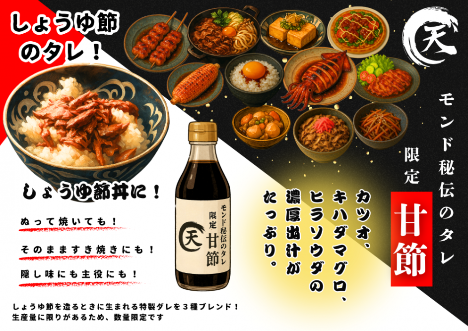 宮崎県日南市で受け継がれてきた伝統製法で仕込む「しょうゆ生節」。その製造工程で生まれる、濃厚な旨みたっぷりの特製ダレを贅沢にブレンドしました。カツオ・キハダマグロ・ヒラソウダの3魚種の出汁が重なり合い、奥深い風味が特徴です。しょうゆ節丼の仕上げタレにはもちろん、すき焼きや煮物の味付けにもおすすめです。